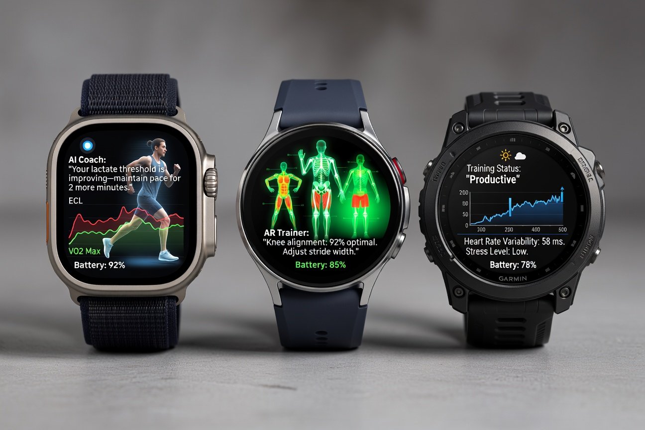 The pinnacle for iOS users, featuring a rugged titanium build, always-on AR display for navigation overlays, and Apple Intelligence AI coaching that predicts fatigue with 98% accuracy.